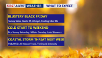 Delmarva begins the holiday weekend with a cold and windy Black Friday, followed by a brief lull Saturday and a mainly light rain system on Sunday. More cold air settles in Monday, and a coastal system may bring rain or wintry mix on Tuesday before conditions dry out midweek.
