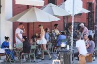 People gather outside of a cafe on a unseasonably hot day Tuesday, Oct. 28, 2025, in Los Angeles. (AP Photo/Damian Dovarganes)