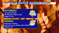 High pressure keeps Delmarva sunny and cool to end the week before a warm front brings showers Saturday night into Sunday. A strong cold front Sunday ushers in gusty winds and a sharp drop in temperatures through next week.