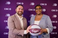 Toronto Tempo general manager Monica Wright Rogers, right, and assistant general manager Eli Horowitz pose for a photo after speaking to media following the WNBA Expansion Draft in Toronto, Friday, April 3, 2026. (Sammy Kogan/The Canadian Press via AP)