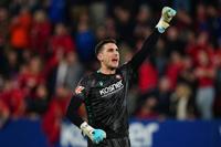 Osasuna's goalkeeper Sergio Herrera celebrates at the end of the Spanish La Liga soccer match between Osasuna and Real Madrid in Pamplona, Spain, Saturday, Feb. 21, 2026. (AP Photo/Miguel Oses)