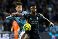Real Madrid's Vinicius Junior, duels for the balls with Celta's Javi Rodriguez during a Spanish La Liga soccer match between Celta Vigo and Real Madrid in Vigo, Spain, Friday, March 6, 2026. (AP Photo/Lalo R. Villar)
