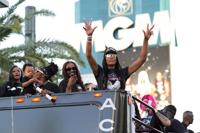 Led by a group of classic low-rider automobiles showing off their hydraulics, five double-deck buses traveled from Tropicana Boulevard down Las Vegas Boulevard, the last one carrying the Aces, who threw streamers and confetti to thousands of fans who began arriving four hours before the start of the parade and lined the road that's been known for some of the world’s greatest headliners dating to the 1960s Rat Pack era.