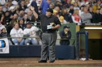 FILE - Umpire Bruce Froemming, right, signals a home run for New York Yankees' Johnny Damon after conferring with his crew during the first inning of Game 1 of an American League Division Series baseball game against the Cleveland Indians, Oct. 4, 2007, in Cleveland.