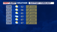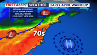 DELMARVA -- Today marks the beginning of a warmer stretch across Delmarva as high pressure slides off the East Coast and a warm front gradually lifts north through the region. The day will feature a partly sunny and breezy sky, with just a few isolated showers possible early on. Afternoon temperatures will climb into the upper 60s to near 70 degrees, offering a mild start to the week.