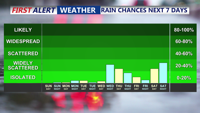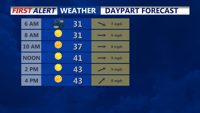 Late Sunday evening, skies trend mostly clear as winds ease. Temperatures stay well above freezing, and no impacts are expected. Overnight lows are forecast to drop into the upper 20s to near 30 degrees, with a colder feel as drier air settles in.