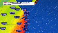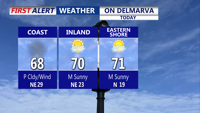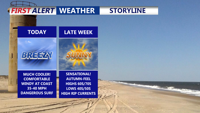 As the tropical systems drift eastward, skies will clear with sunshine spreading across the region. Highs will reach the upper 60s to low 70s, which is typical for early October. Winds remain a factor, however, with gusts of 25 to 35 mph along the coast and 15 to 25 mph inland. Beach communities will gusts up to 40 mph. Dangerous swells and rip currents will persist, with waves building between six and 11 feet. The high rip current risk is expected to last through the end of the week. Coastal Flood Advisories are up until 8PM for the DE coast, could see up to a foot of inundation during the high tide cycle through this evening.Â