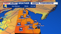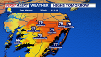 By Thursday morning, high pressure is forecast to build into the region, bringing dry conditions and a noticeable warmup. Temperatures are expected to climb into the low to mid-70s by Thursday afternoon, with inland areas of Delmarva potentially turning a bit warmer than locations along the coast and bay.