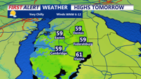On Friday, the cool, dry air remains in place. Expect a mix of sun and scattered afternoon clouds. High temperatures are forecast to reach the upper 50s to near 60 degrees, with slightly cooler readings in any higher elevation pockets. Skies remain generally dry with no significant precipitation expected.