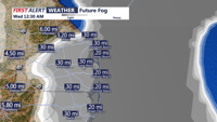 Expect fog to become widespread overnight, with computer guidance showing a high chance of visibilities dropping below 1/4 mile at times. The fog is being fueled by moist, milder air flowing in off the Atlantic and sliding over colder ground, a setup that often traps moisture near the surface and thickens fog quickly.