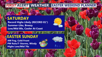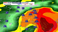 Some heavier downpours are possible with plenty of moisture in place. Rainfall totals will generally range from around one-half inch to three-quarters of an inch, although locally higher amounts may occur where heavier showers or storms develop. Because the system should move through fairly quickly, flash flooding is not expected to be a major concern right now. It will also be windy Sunday, with southwest winds gusting from 25 to 35 mph ahead of the front and similarly gusty westerly winds behind it.