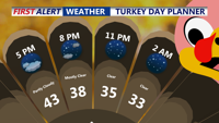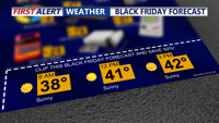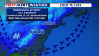 Tonight will stay breezy and turn sharply colder, with lows dropping into the upper twenties to low thirties. If you’re heading out early for Black Friday shopping, be prepared for wind chills in the low twenties in the morning.
