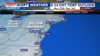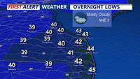 By Thursday night, high pressure will slide farther offshore, allowing warm advection to increase cloudiness over the region once again. Lows along coastal Sussex County are expected to stay in the forties, slightly milder than earlier in the week.