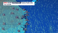 Early Tuesday morning, temperatures are expected to sit below freezing with light winds, reducing the bite compared with recent mornings. Cloud cover is expected to increase through the day as warmer air begins moving in aloft, helping temperatures climb closer to seasonal levels by afternoon.