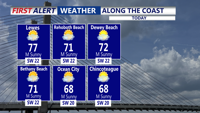 Wednesday looks to be the warmest day of the stretch, with partly cloudy skies and inland highs reaching the low to mid 80s. That could put record highs in jeopardy, especially in Georgetown, where the record is 80 degrees set in 1979, and in Salisbury, where the record is 83 degrees set in 1978. Beaches and coastal communities will stay cooler, with highs mainly in the 60s and 70s.
