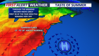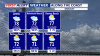 The bigger story arrives early next week as a significant warming trend takes hold across Delmarva. High pressure will briefly build in behind the weekend front, then shift east and allow a prolonged return flow to set up. That pattern will send temperatures steadily upward, with highs climbing well into the 80s by the middle of next week. In the typical hotter spots, 90 degrees cannot be ruled out. The record high in Georgetown for Wednesday is 86, then 89 for Thursday. Overnight lows will also turn much milder, only falling into the 60s.