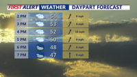 DELMARVA - Partly cloudy skies are forecast late Tuesday evening, with lows around 38 degrees and a southwest wind near 10 mph, gusting up to 20 mph. Conditions should remain quiet into Wednesday, though clouds will increase through the day. Highs are expected to reach near 54 degrees with lighter southwest winds at 5 to 10 mph.