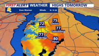 The best chance for showers came earlier with a warm front lifting north, but an isolated shower could still develop this evening into tonight as a weak cold front slips south. Overnight lows are expected to fall into the 40s, and patchy fog may develop as light winds and lingering moisture settle over the area.