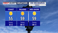 Meteorologist Chris Mastrobuono has the latest on a cooler breezy day on Delmarva as a cold front pushes through, an isolated shower is possible, highs in the mid to upper 50s, freeze warning tonight through Tuesday morning, temperatures falling as low as the upper 20s.