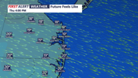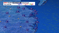 Despite the sunshine, afternoon highs Thursday are expected to reach only the low to mid 30s. Gusty northwest winds will persist through much of the day, keeping wind chills in the low 20s, then teens later in the day, reinforcing the wintry feel.