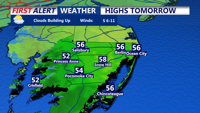 High temperatures Thursday are expected to reach the 40s across most of the county, with the warmest readings possible in southern portions of Delmarva. While most of the day should remain dry, there is a slight chance of showers developing late Thursday, with rain chances around 20 to 30 percent during daylight hours.