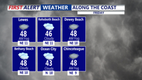 Friday brings a cold front sliding in from the northeast, flipping winds to the east and reinforcing a cooler, cloudier feel across Delmarva. Highs are expected to run mainly in the 40s and 50s, and while it won’t be a washout, periods of drizzle and a few spotty showers can’t be ruled out.