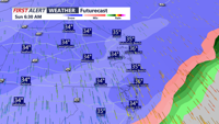 Snow tapers Sunday as arctic air pours in on gusty west to northwest winds. Temperatures may struggle to rise during the day and could even fall by afternoon, leading to dangerous wind chills and areas of blowing snow. Sunday night lows drop into the teens, with wind chills falling into the single digits.