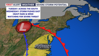 A powerful storm system moving in from the central U.S. will reach Delmarva by Wednesday, bringing widespread rain and strong winds. Rain showers may develop late Tuesday night, becoming more widespread Wednesday afternoon and evening as a potent cold front moves through.
