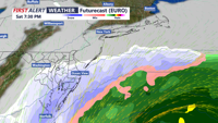 A closer, more northward coastal track would increase the risk of higher snow totals, stronger winds, and greater coastal flooding impacts.
