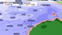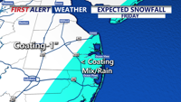 Snow arrives Friday morning, milder air moves in off the ocean changing snow to mix and rain into the afternoon, especially at the beaches.