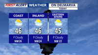 DELMARVA -- An arctic cold front will cross Delmarva this afternoon, bringing partly cloudy skies and a noticeable increase in northwest winds as colder air surges into the region. Gusts are expected to reach 25 to 30 mph, making Thursday’s mid- to upper-40s temperatures feel significantly colder.