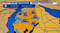 DELMARVA -- A crisp and autumnal Sunday is on tap for Delmarva, with plenty of sunshine but a notable breeze from the northwest, gusting up to 20 mph. Temperatures will only reach the upper 60s to low 70s, accompanied by very low humidity as dew points dip into the upper 30s and low 40s. It's the perfect day to enjoy the outdoors, but you may want to bring a light jacket along.
