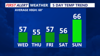 Temperatures in the mid to upper 50s, rising above average Sunday.