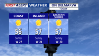 DELMARVA -- High pressure building across the Southeast is helping to keep Delmarva dry today, even as a strong low over southeastern Quebec keeps the pressure gradient tight. That means another windy day, with west-southwest gusts around 25 to 30 mph this afternoon. Despite the breeze, cold air is not as strong as yesterday, and afternoon temperatures will climb into the mid to upper 50s across the Peninsula under mostly clear skies.