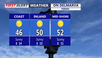 DELMARVA -- It is all about sunshine today, but don’t let the bright sky fool you because it is still a chilly day from start to finish. High temperatures will remain stuck in the 40s for many communities, while parts of the Mid-Shore may manage to reach the low 50s. An east-northeast wind at 10 to 20 mph will keep the air feeling even cooler.