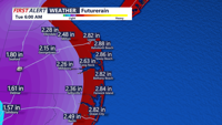 Heavy rain is forecast across the region, with widespread totals of 1 to 3 inches and localized amounts up to 5 inches possible, particularly near the coast. The greatest flood risks will occur in poor drainage and urban areas, though prolonged rainfall could worsen coastal flooding. Strong northeast winds and high tides will pile water against the shoreline, causing beach erosion, dune breaches, and potentially major coastal flooding.