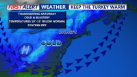 Thanksgiving and Black Friday will feel brisk, with strong northwesterly winds and continued cold air advection. Highs will remain in the forties both days, and overnight lows will fall into the twenties. Despite the chill and breezy conditions, the holiday period currently looks dry.