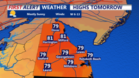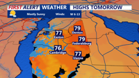 Monday’s weather will continue much like Sunday’s, featuring mostly sunny skies and warm afternoon highs in the low 80s. Light south-southwest winds around 5 to 10 mph will bring in a touch of humidity as dew points rise into the upper 50s.