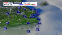 By Wednesday, skies are expected to clear as a cold front moves through, bringing a sunny but windy day. Highs are forecast near 56 degrees, with west winds at 10 to 15 mph and gusts as high as 30 mph before winds begin easing Wednesday evening.