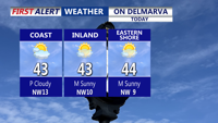 DELMARVA -- High pressure building in from the southwest delivers a dry, mostly sunny day across Delmarva. Afternoon highs reach the low 40s, and winds ease through the day as the center of high pressure drifts south of the region. Tonight mainly clear and cold. Lows fall into the upper 20s to low 30s.
