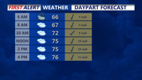 Tuesday morning will start mild and humid, with lows ranging from the upper 50s inland to the mid-60s along the coast. Skies will be mostly cloudy through the day, though most of the area is expected to remain dry. Afternoon highs will climb into the mid-70s to low 80s, warmest inland. Winds will pick up near coastal areas, with gusts reaching 20 mph by late in the day.