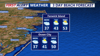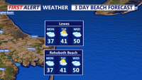 By Monday, high pressure building in from the Great Lakes will keep conditions dry and cold. Highs will struggle to reach the mid-thirties in Sussex County, with a mix of sun and clouds through the afternoon. A weak coastal low developing well to the south may bring light snow to parts of the lower Delmarva, but any precipitation is expected to remain south of Sussex County.