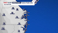 Saturday’s departing system will leave behind cold and blustery conditions. Highs in the mid to upper 30s across the peninsula. Arctic high pressure will take hold Sunday into early next week, with highs on Sunday barely getting to the 30 degree mark with overnight lows in the teens. Feels like temperatures will be in the single digits and teens all weekend.