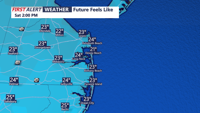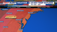 Looking ahead, a weak low-pressure system may impact the region Monday night into Christmas Eve, bringing light precipitation and the possibility of wintry weather, especially for northern Delaware. Temperatures are expected to rebound slightly, reaching the low to mid 40s on Tuesday. Christmas Day is trending dry, partly to mostly cloudy skies and highs in the mid 40s. In fact we will likely see a shift to some above average temperatures late week heading into New Year's Eve.