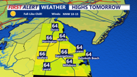 The high-pressure system will continue to bring fair weather, keeping skies mostly sunny. High temperatures will only reach the low to mid-60s across Delmarva, feeling more like late October than early October due to the cooler, below-normal conditions. Northerly winds will persist at 10 to 15 mph, adding a slight chill to the air.