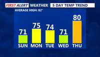 The end of the week looks pleasant. Thursday should be the warmest day of the stretch with highs in the low 80s. A dry cold front will sweep through late in the week, bringing cooler, comfortable conditions into the weekend as high pressure once again settles over the region.