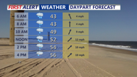 Temperatures will be relatively mild, climbing into the mid-to-upper 50s. Winds will shift from the southeast to the southwest as the system moves through, with occasional gusts making it feel a bit cooler. By late evening, drier air will start to filter in as high pressure begins to build. Overnight temperatures will drop into the mid-30s, so bundle up if you're heading out late.