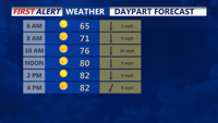 Sunday will continue the trend of excellent weather. The day will begin with sunny skies and temperatures in the mid-60s. By midday, temperatures will climb to a pleasant 85°F. Winds will shift slightly to the south, remaining light at around 5 to 10 mph.