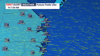 A warming trend arrives Sunday and Monday as another low-pressure system and its fronts approach the coast. Highs will rebound into the upper forties and low fifties, though the milder readings come with increasing chances for rain. Light showers are possible Sunday, with better chances Sunday night into Monday.