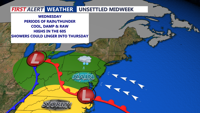 The unsettled pattern continues through the second half of the week as an upper-level trough and low pressure system over the Great Lakes move east. The best chance for additional rain and thunderstorms will be Wednesday night, followed by scattered showers Thursday. We start to dry out on Friday with temperatures in the 70s.